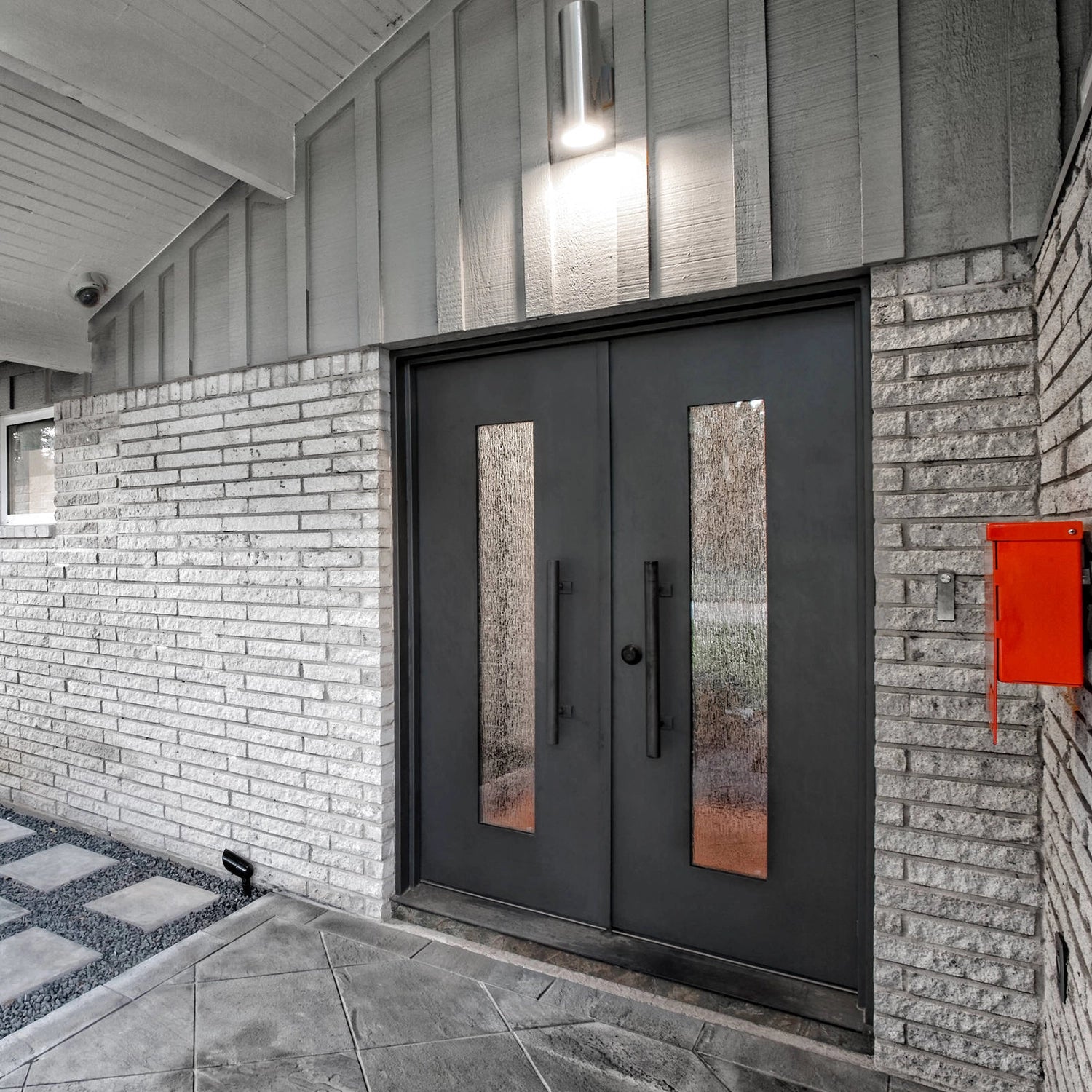 Designed for modern and contemporary entrances, this iron double door features large solid panels with two vertical glass insets, offering a choice between clear glass for a view and rain glass for privacy. Equipped with minimalist handles, it combines durability, security, and timeless style while providing exceptional strength and weather resistance.